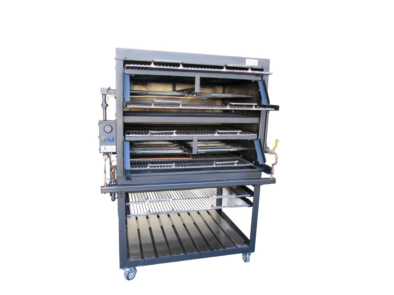 ¿Necesitas mejorar tu productividad?, te presentamos este horno asador para arepas fabricado en lámina CR calibre 18 con recubrimiento en fibra de vidrio, base en ángulo de hierro de 1 ½” y pintado con pintura electrostática. Consta de seis parrillas las cuales se intercambian de posición facilitando la practicidad del equipo debido a que no se requiere voltear las arepas, dos de ellas auxiliares. Sistema de gas mediante quemadores tipo flauta operados con control de temperatura análogo mediante termostato Rainbow de 0 a 320°, piloto y muletilla. Malla española, la cual distribuye el calor de manera uniforme y permite optimizar el mismo. Entrepaño inferior en el mismo material y rodachinas con freno para fácil desplazamiento y aseo del área. Cada parrilla tiene una capacidad aprox. de 15 arepas.