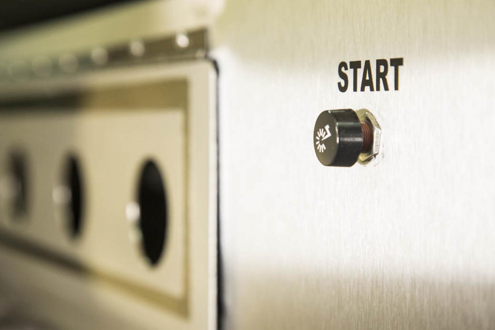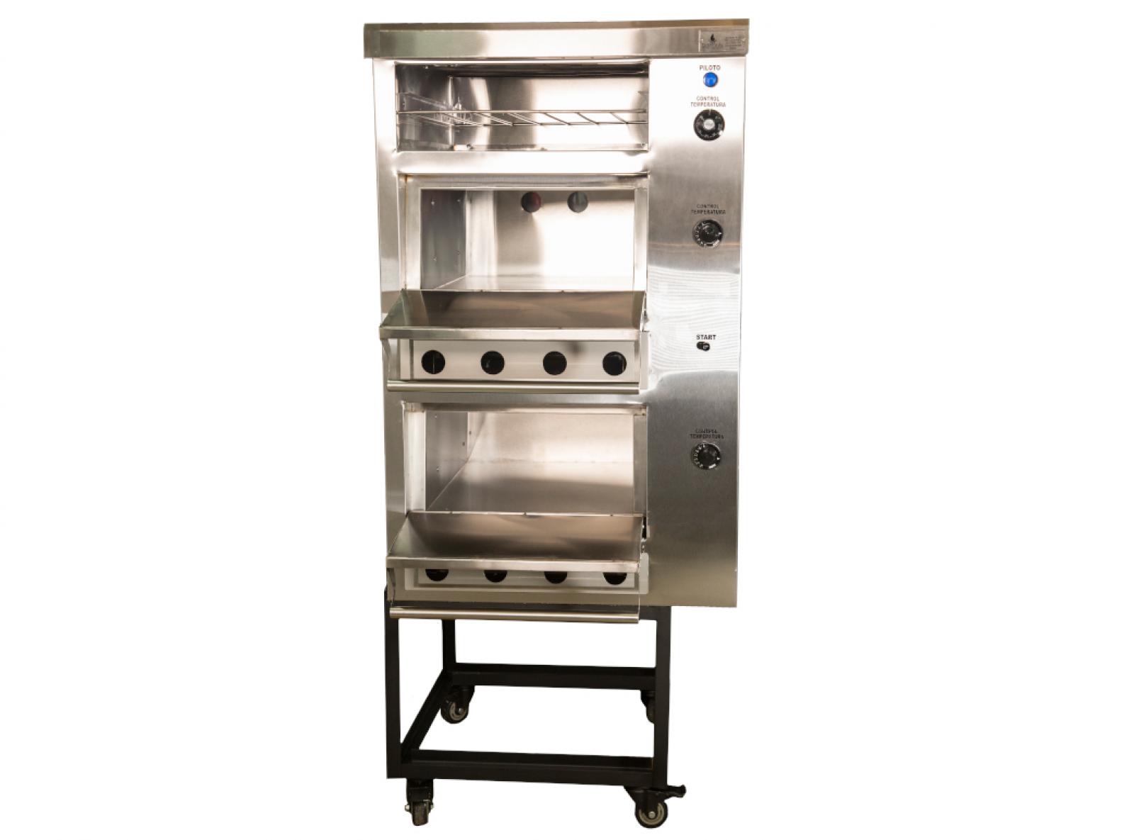 Estructura fabricada en acero satinado calibre 18 interno y calibre 20 externo AISI 430 con base de soporte en tubería de hierro pintada y rodachinas para fácil desplazamiento. Consta de: Un gratinador sin puerta en parte superior con rejilla en acero inoxidable, sistema de funcionamiento por medio de resistencia de 5/16” a 220 voltios para 8 amperios que equivalen a un consumo promedio de energía de $1.500 / hora, un termostato de 0 a 320° con piloto de encendido y dos cámaras con funcionamiento independiente semi automático mediante termostato Copreci con termocupla de seguridad y quemadores tipo flauta en hierro. Este horno es especial para cualquier producto de panadería y pastelería. Su capacidad es para una lata de 46 x 57 cms por cada cámara. Medidas: 0.75 x 0.80 x 1.70 mts.