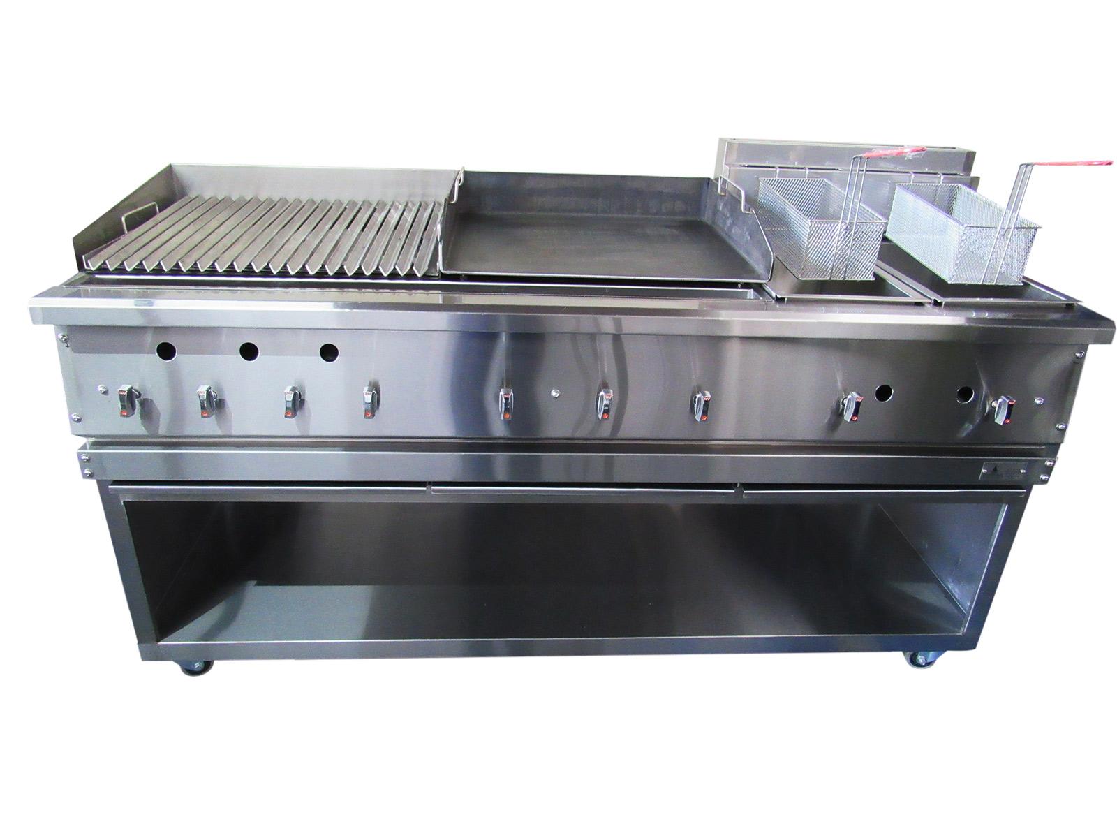 Equipo mixto de cocina que ofrece una variedad de servicios como asado a la plancha o en parrilla y todo tipo de fritura. Estructura en acero satinado calibre 20 AISI 430 cubierto a tres lados y rodachinas para fácil desplazamiento. Sistema de gas compuesto por quemadores de alto rendimiento en hierro soldado, válvulas de ajuste mecánico y perillas de lujo. Consta de: Una parrilla asadora en acero inoxidable de 60 cms con piedras refractarias que nos permiten una fuente de calor más limpia, una plancha asadora de 60 cms en platina de hierro de ¼” y dos freidoras de 30 cms con un porta canastilla especial.