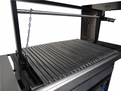 Sistema de gas compuesto por quemadores rectangulares en hierro de alto rendimiento con válvulas de ajuste mecánico y perillas de lujo. Mecanismo de malacate sencillo mediante chumaceras, piñones y cadena. Entrepaño y rodachinas para fácil desplazamiento.